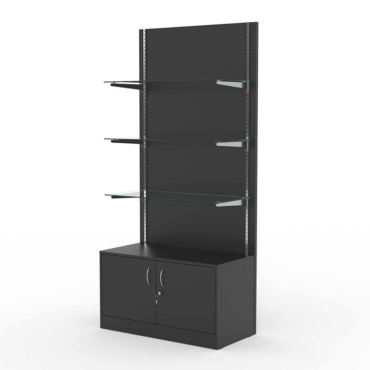 Каркас из ДСП. Три стеклянные полки. Нагрузка на полки — 5-7кг при равномерном размещении продукции. В основании — тумба с дверями, закрывающимися на ключ.