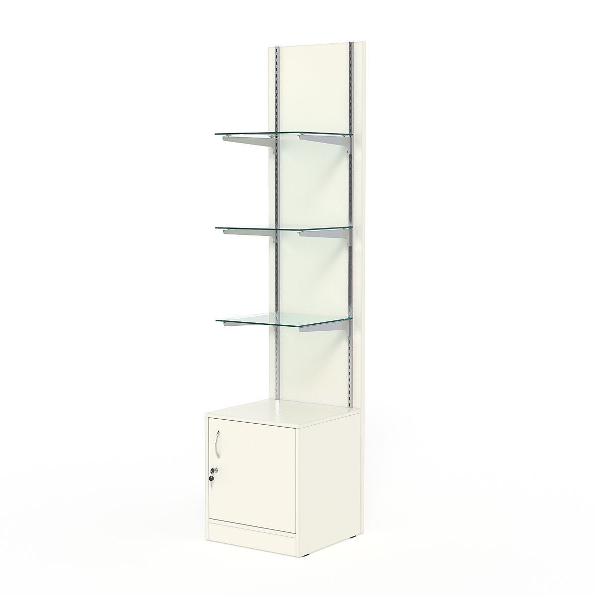 Стеллаж представляет собой открытую конструкцию с задней стенкой и накопителем из ДСП. На стенке располагаются три стеклянные полки. Дополнительную прочность каркасу придают металлические вставки и держатели полок. Накопитель оборудован распашной дверью с замком. Нагрузка на полки при равномерном распределении предметов — 5-7кг.