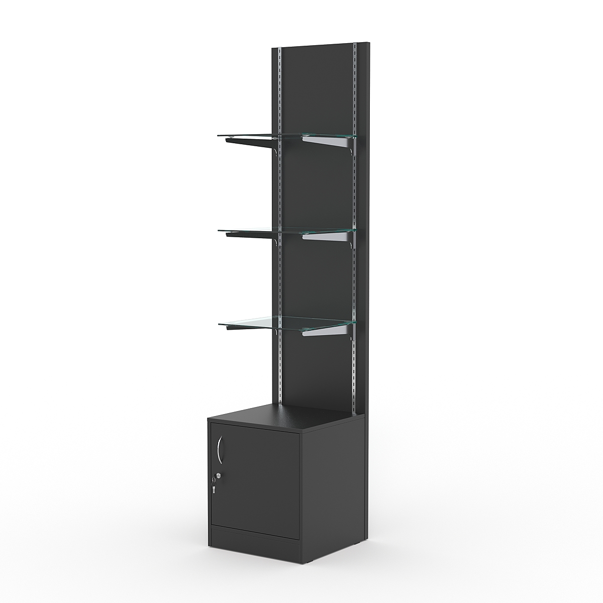 Стеллаж представляет собой открытую конструкцию с задней стенкой и накопителем из ДСП. На стенке располагаются три стеклянные полки. Дополнительную прочность каркасу придают металлические вставки и держатели полок. Накопитель оборудован распашной дверью с замком. Нагрузка на полки при равномерном распределении предметов — 5-7кг.
