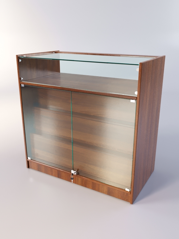 С обратной стороны прилавка расположены дверки, закрываются на замок, посередине предусмотрена полка. Высота верхней стеклянной части 150мм. С фасадной части расположены стеклянные дверки.