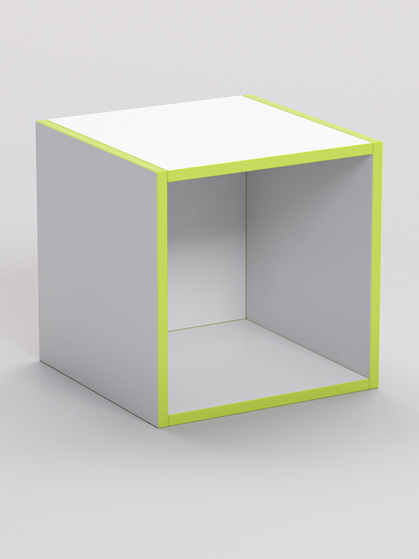 Стеллаж представляет собой куб без передней стенки. Каркас выполнен из ЛДСП. Цвет каркаса возможен в семи вариантах.