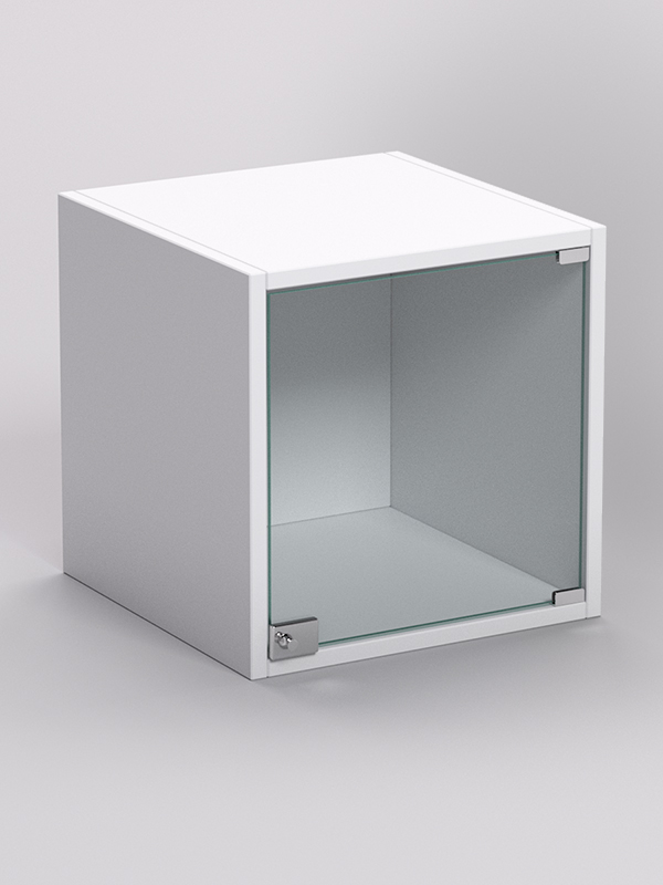 Стеллаж представляет собой куб со стеклянной дверью. Дверь закрывается на ключ. Каркас выполнен из ЛДСП. Цвет каркаса возможен в семи вариантах.