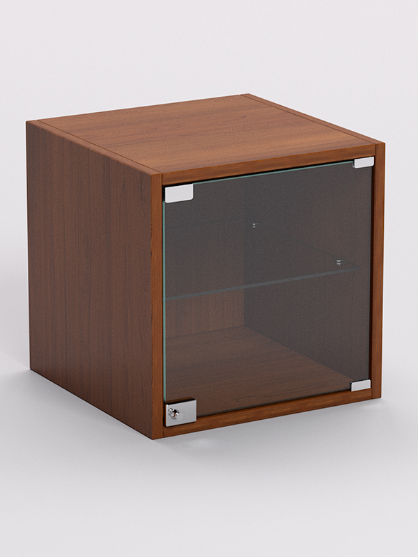 Стеллаж представляет собой куб со стеклянной дверью. Дверь закрывается на ключ. Внутри имеется стеклянная полка. Нагрузка на стекло при равномерном распределении предметов сставляет 5-7кг. Каркас выполнен из ЛДСП. Цвет каркаса возможен в семи вариантах.