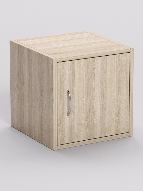 Стеллаж представляет собой закрытый шкаф с распашной дверью. Дверь служит декоративным элементом, изготовлена из материала другого цвета. Каркас шкафа выполнен из ЛДСП. Цвет каркаса возможен в семи вариантах.