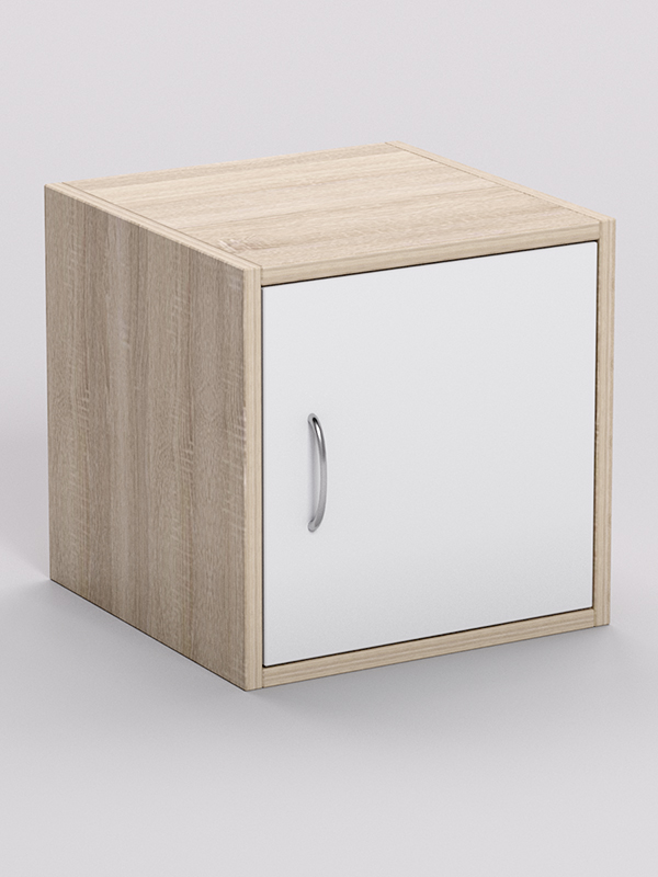 Стеллаж представляет собой закрытый шкаф с распашной дверью. Дверь служит декоративным элементом, изготовлена из материала другого цвета. Каркас шкафа выполнен из ЛДСП. Цвет каркаса возможен в семи вариантах.