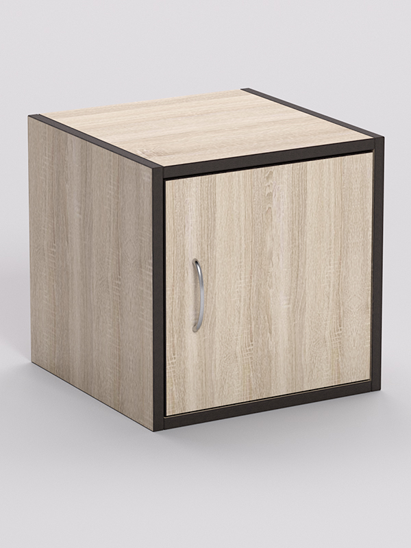 Стеллаж представляет собой закрытый шкаф с распашной дверью. Дверь служит декоративным элементом, изготовлена из материала другого цвета. Каркас шкафа выполнен из ЛДСП. Цвет каркаса возможен в семи вариантах.
