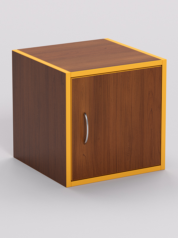 Стеллаж представляет собой закрытый шкаф с распашной дверью. Дверь служит декоративным элементом, изготовлена из материала другого цвета. Каркас шкафа выполнен из ЛДСП. Цвет каркаса возможен в семи вариантах.