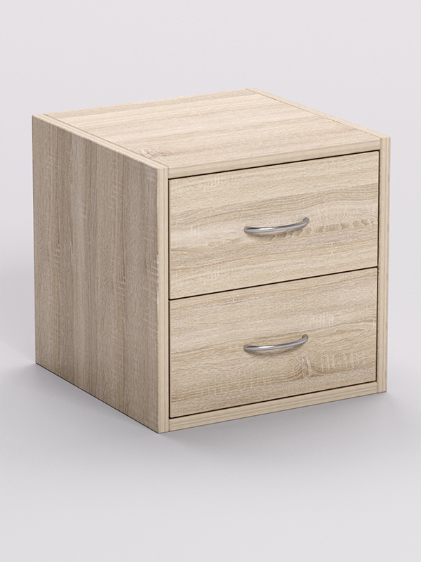 Стеллаж представляет собой квадратный шкаф с двумя выдвижными ящиками. Цвет ящиков отличается от цвета основной конструкции, благодаря чему стеллаж выглядит более эффектно. Каркас выполнен из ЛДСП. Цвет каркаса возможен в семи вариантах.