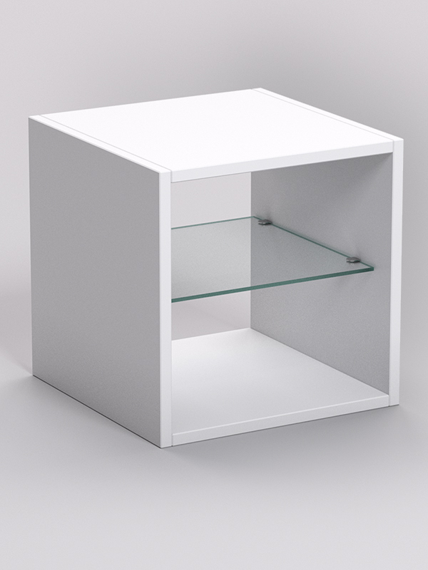 Стеллаж представляет собой куб без передней и задней стенок. Внутри имеется стеклянная полка. Нагрузка на стекло при равномерном распределении предметов составляет 5-7кг. Каркас выполнен из ЛДСП. Цвет каркаса возможен в семи вариантах.