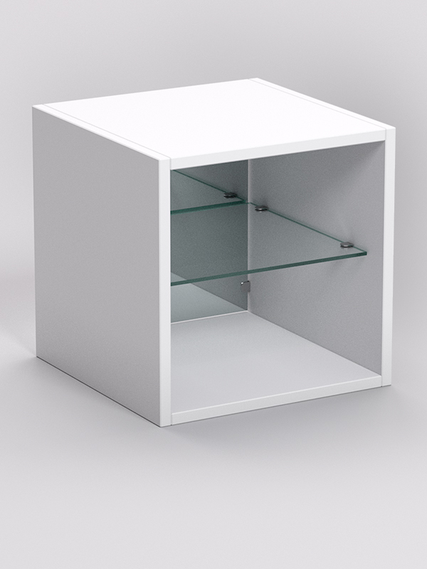 Стеллаж представляет собой куб без передней стенки. Задняя стенка зеркальная. Внутри имеется стеклянная полка. Нагрузка на стекло при равномерном распределении предметов составляет 5-7кг. Каркас выполнен из ЛДСП. Цвет каркаса возможен в семи вариантах.