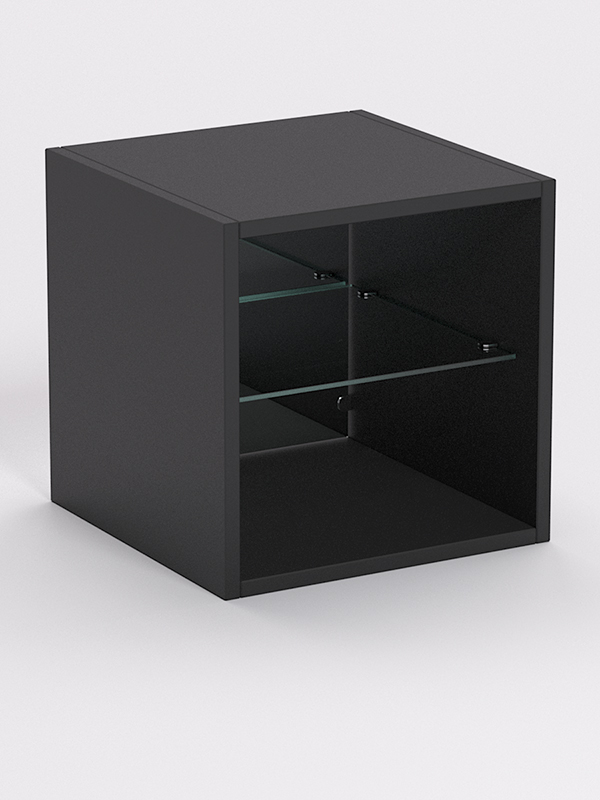 Стеллаж представляет собой куб без передней стенки. Задняя стенка зеркальная. Внутри имеется стеклянная полка. Нагрузка на стекло при равномерном распределении предметов составляет 5-7кг. Каркас выполнен из ЛДСП. Цвет каркаса возможен в семи вариантах.