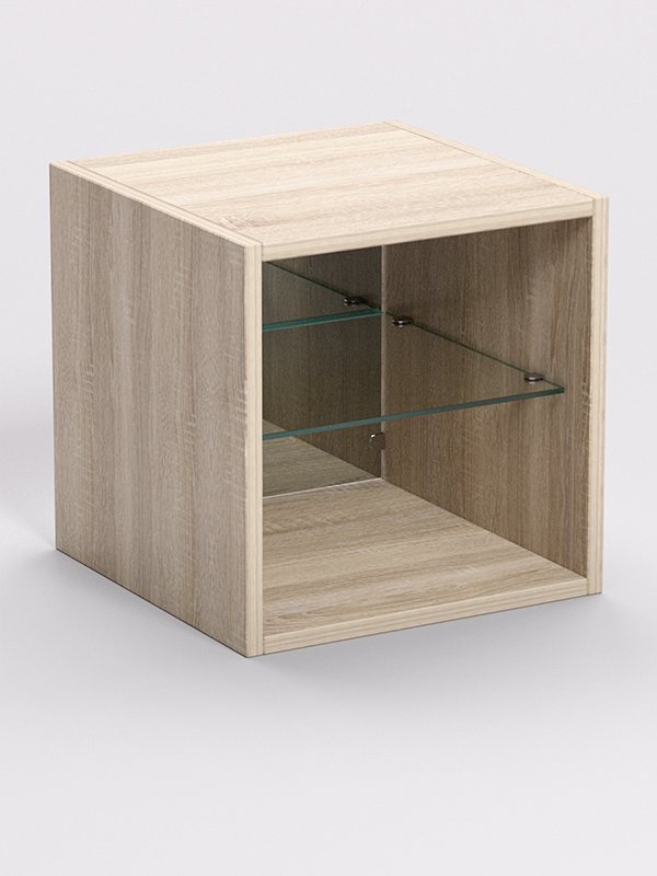 Стеллаж представляет собой куб без передней стенки. Задняя стенка зеркальная. Внутри имеется стеклянная полка. Нагрузка на стекло при равномерном распределении предметов составляет 5-7кг. Каркас выполнен из ЛДСП. Цвет каркаса возможен в семи вариантах.