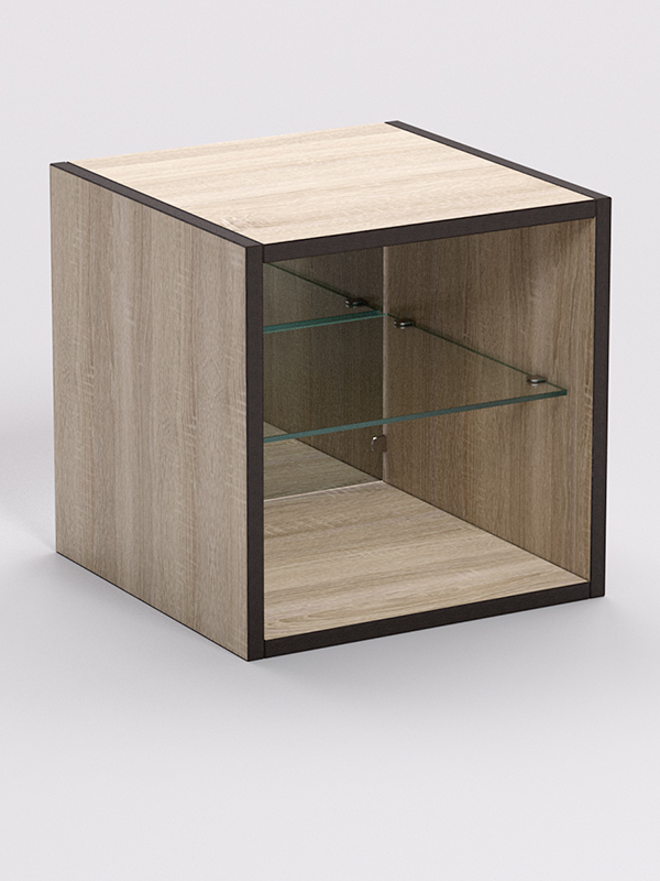Стеллаж представляет собой куб без передней стенки. Задняя стенка зеркальная. Внутри имеется стеклянная полка. Нагрузка на стекло при равномерном распределении предметов составляет 5-7кг. Каркас выполнен из ЛДСП. Цвет каркаса возможен в семи вариантах.