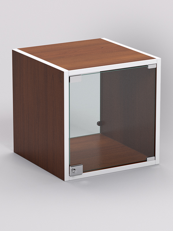 Стеллаж представляет собой шкаф с распашной дверью. Дверь и задняя стенка выполнены из стекла. Каркас изготовлен из ЛДСП. Цвет каркаса возможен в семи вариантах.