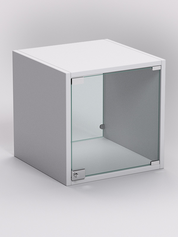 Стеллаж представляет собой шкаф с распашной дверью. Дверь и задняя стенка выполнены из стекла. Каркас изготовлен из ЛДСП. Цвет каркаса возможен в семи вариантах.
