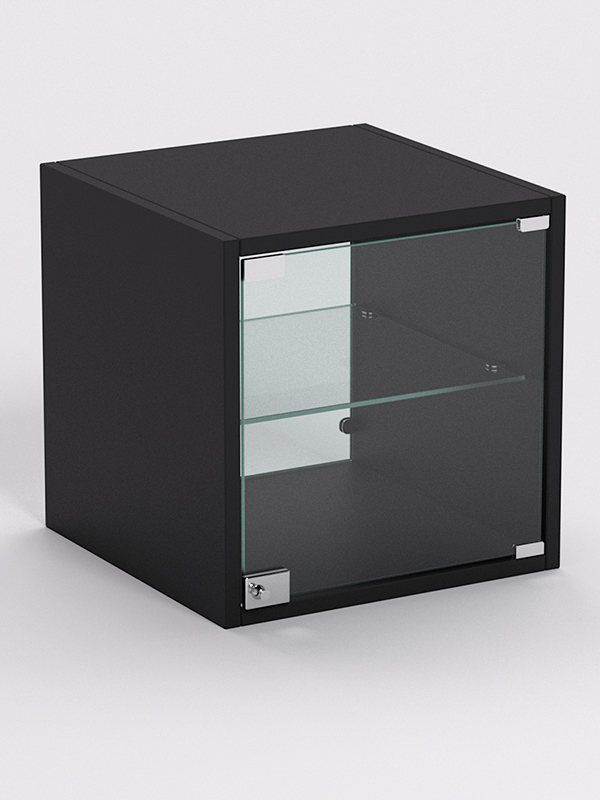 Стеллаж представляет собой шкаф с распашной дверью. Дверь и задняя стенка выполнены из стекла. Каркас изготовлен из ЛДСП. Цвет каркаса возможен в семи вариантах. Внутри шкафа имеется стеклянная полка. Нагрузка на полку при равномерном распределении предметов составляет 5-7 кг.