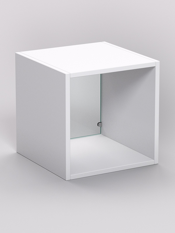 Стеллаж представляет собой куб с открытой передней стенкой. Задняя стенка выполнена из стекла. Каркас стеллажа изготовлен из ЛДСП. Цвет каркаса возможен в семи вариантах.