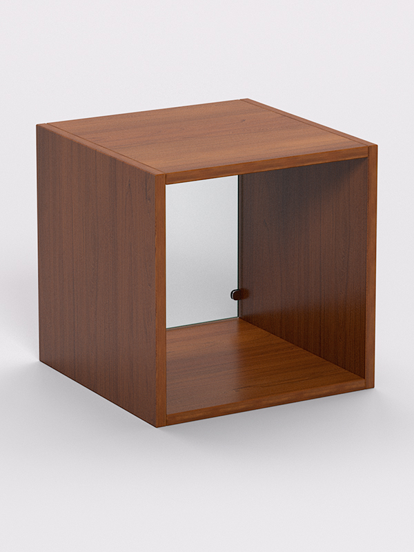 Стеллаж представляет собой куб с открытой передней стенкой. Задняя стенка выполнена из стекла. Каркас стеллажа изготовлен из ЛДСП. Цвет каркаса возможен в семи вариантах.