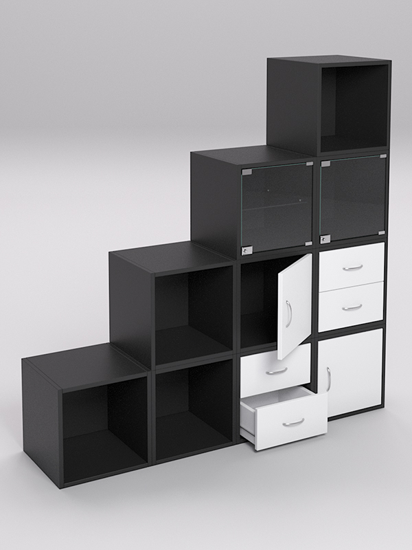 Комплект из 10 модулей Лего. Включает модели с задней стенкой и без нее, с выдвижными ящиками, с деревянной дверью, со стеклянной полкой и дверью. Модули выполнены в разных цветах, что позволит покупателю выбрать комбинацию на свой вкус.