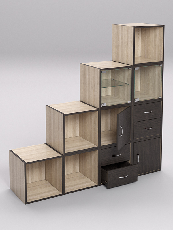 Комплект из 10 модулей Лего. Включает модели с задней стенкой и без нее, с выдвижными ящиками, с деревянной дверью, со стеклянной полкой и дверью. Модули выполнены в разных цветах, что позволит покупателю выбрать комбинацию на свой вкус.
