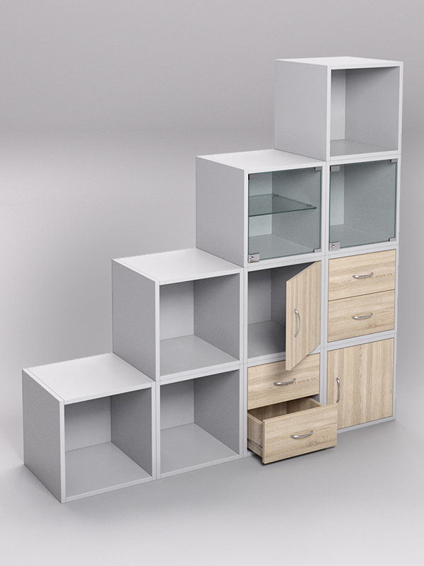 Комплект из 10 модулей Лего. Включает модели с задней стенкой и без нее, с выдвижными ящиками, с деревянной дверью, со стеклянной полкой и дверью. Модули выполнены в разных цветах, что позволит покупателю выбрать комбинацию на свой вкус.