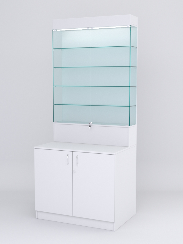 Демонстрационная витрина представляет собой закрытый стеклянный шкаф с четырьмя полками и подсветкой. Нижняя часть — закрытый шкаф из ЛДСП, с распашными дверцами. Витрина и шкаф закрываются на ключ.