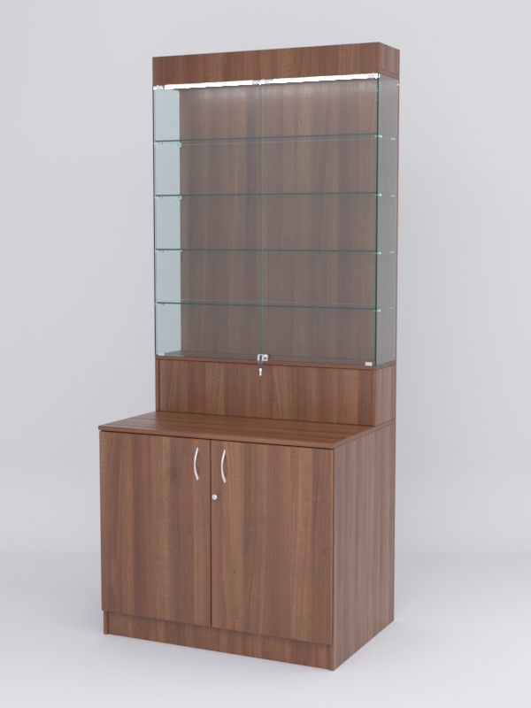 Демонстрационная витрина представляет собой закрытый стеклянный шкаф с четырьмя полками и подсветкой. Нижняя часть — закрытый шкаф из ЛДСП, с распашными дверцами. Витрина и шкаф закрываются на ключ.