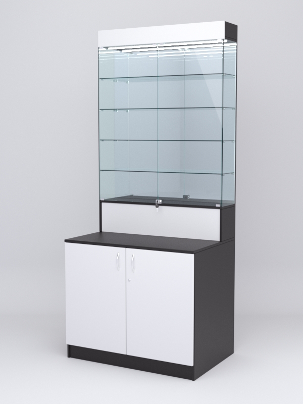Демонстрационная витрина представляет собой закрытый стеклянный шкаф с четырьмя полками и подсветкой. Задняя стенка зеркальная. Нижняя часть — закрытый шкаф из ЛДСП, с распашными дверцами. Витрина и шкаф закрываются на ключ.