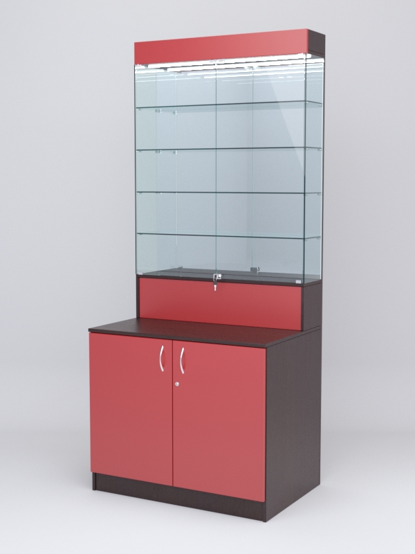 Демонстрационная витрина представляет собой закрытый стеклянный шкаф с четырьмя полками и подсветкой. Задняя стенка зеркальная. Нижняя часть — закрытый шкаф из ЛДСП, с распашными дверцами. Витрина и шкаф закрываются на ключ.