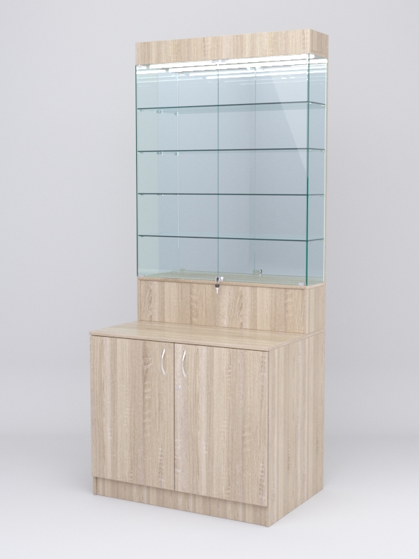 Демонстрационная витрина представляет собой закрытый стеклянный шкаф с четырьмя полками и подсветкой. Задняя стенка зеркальная. Нижняя часть — закрытый шкаф из ЛДСП, с распашными дверцами. Витрина и шкаф закрываются на ключ.