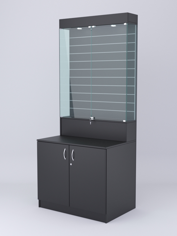 Демонстрационная витрина представляет собой закрытый стеклянный шкаф с подсветкой. Задняя стенка — экономпанель. В нижней части конструкции расположен закрытый шкаф из ДСП, с распашными дверцами. Витрина и шкаф закрываются на ключ.