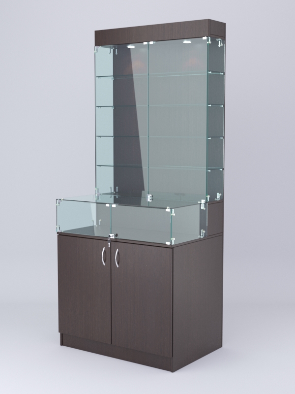 Демонстрационная витрина представляет собой закрытый стеклянный шкаф с четырьмя полками и подсветкой. В нижней части конструкции расположен закрытый шкаф с настольной витриной из стекла, дверцы и корпус шкафа из ДСП. Обе витрины и шкаф закрываются на ключ.