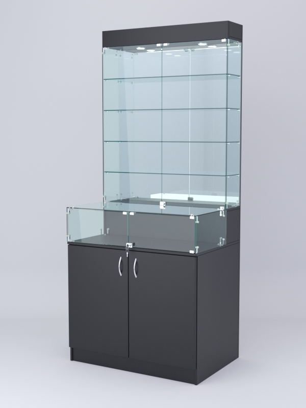 Демонстрационная витрина представляет собой закрытый стеклянный шкаф с четырьмя полками и подсветкой. Задняя стенка витрины зеркальная. В нижней части конструкции расположен закрытый шкаф с настольной витриной из стекла, дверцы и корпус шкафа из ДСП. Обе витрины и шкаф закрываются на ключ.