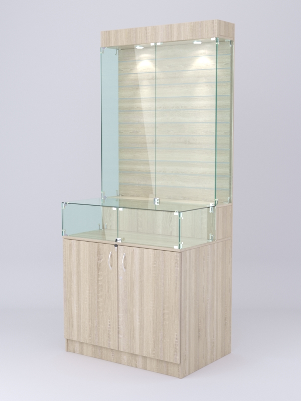 Демонстрационная витрина представляет собой закрытый стеклянный шкаф с подсветкой. Задняя стенка витрины — экономпанель. В нижней части конструкции расположен закрытый шкаф с настольной витриной из стекла, дверцы и корпус шкафа из ДСП. Обе витрины и шкаф закрываются на ключ.