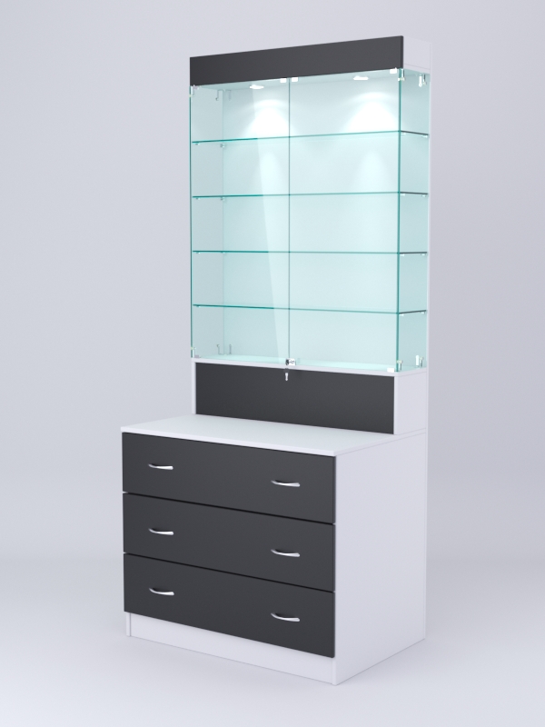 Демонстрационная витрина представляет собой закрытый стеклянный шкаф с четырьмя полками и подсветкой. Дверцы закрываются на ключ. Каркас и задняя стенка выполнены из ДСП. В нижней части конструкции находится три выдвижных ящика.