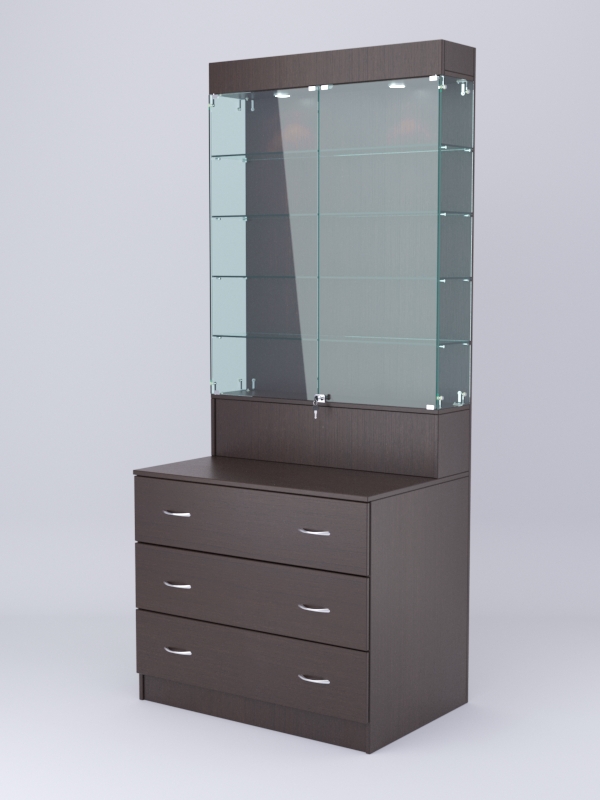 Демонстрационная витрина представляет собой закрытый стеклянный шкаф с четырьмя полками и подсветкой. Дверцы закрываются на ключ. Каркас и задняя стенка выполнены из ДСП. В нижней части конструкции находится три выдвижных ящика.