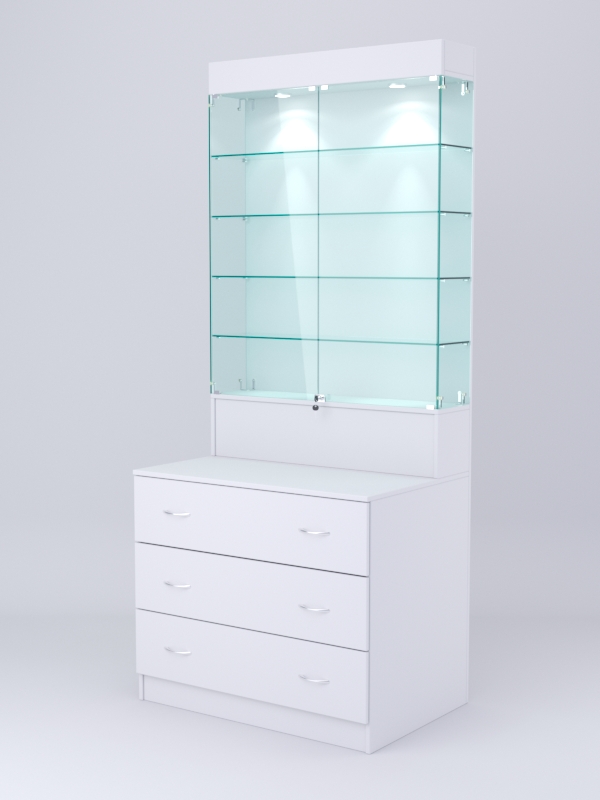 Демонстрационная витрина представляет собой закрытый стеклянный шкаф с четырьмя полками и подсветкой. Дверцы закрываются на ключ. Каркас и задняя стенка выполнены из ДСП. В нижней части конструкции находится три выдвижных ящика.