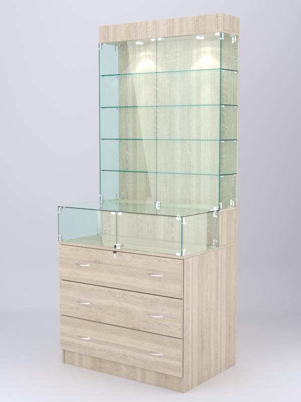 Демонстрационная витрина представляет собой закрытый стеклянный шкаф с четырьмя полками и подсветкой. Каркас и задняя стенка выполнены из ДСП. Дверцы закрываются на ключ. В нижней части конструкции располагаются настольная витрина под стеклом и три выдвижных ящика.