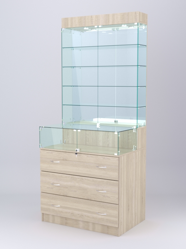 Демонстрационная витрина представляет собой закрытый стеклянный шкаф с четырьмя полками и подсветкой. Задняя стенка зеркальная. В нижней части конструкции располагаются настольная витрина под стеклом и три выдвижных ящика. Обе витрины закрываются на ключ.