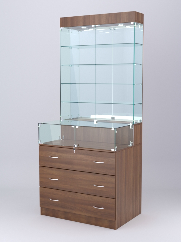 Демонстрационная витрина представляет собой закрытый стеклянный шкаф с четырьмя полками и подсветкой. Задняя стенка зеркальная. В нижней части конструкции располагаются настольная витрина под стеклом и три выдвижных ящика. Обе витрины закрываются на ключ.