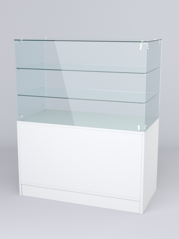 Модель №3 включает витрину и накопитель. Задняя стенка у витрины отсутствует, обеспечивая доступ к ней продавца. Накопитель оборудован распашными дверцами с замком. Внутри витрины имеются две стеклянные полки. Каркас выполнен из ЛДСП.
