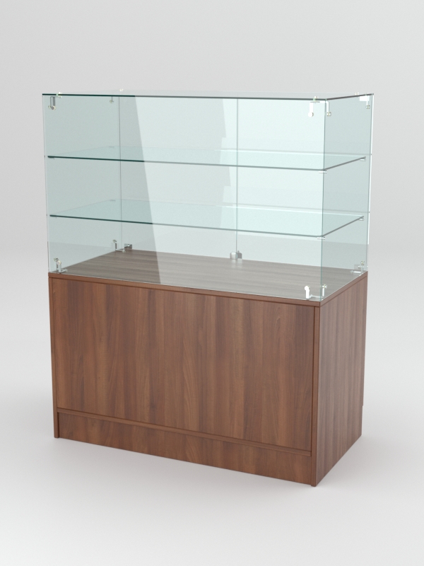 Прилавок состоит из закрытой стеклянной витрины и накопителя. Внутри витрины имеются две стеклянные полки. Со стороны продавца витрина оборудована двумя дверками. Нижнюю часть прилавка занимает накопитель с распашными дверками, открывающимися со стороны продавца. Двери витрины и накопителя закрываются на ключ.
