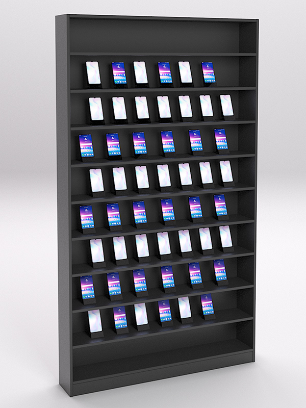 Стеллаж для экспозиции мобильных телефонов, смартфонов и других мелких устройств. Для размещения товаров имеется девять полок. Конструкция устанавливается вдоль стены и не занимает много места. Большое количество полок позволяет представить ассортимент в полном объеме.