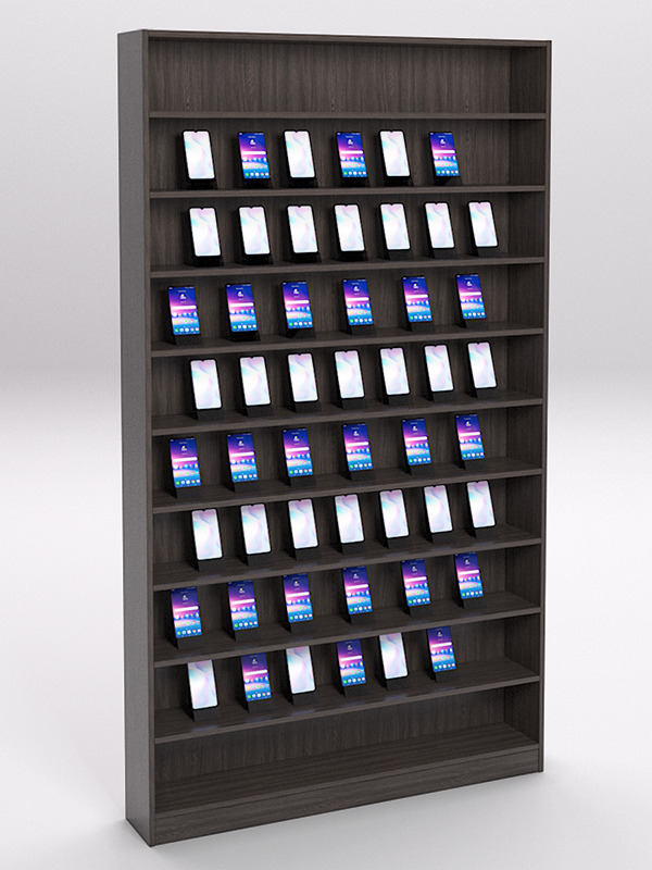 Стеллаж для экспозиции мобильных телефонов, смартфонов и других мелких устройств. Для размещения товаров имеется девять полок. Конструкция устанавливается вдоль стены и не занимает много места. Большое количество полок позволяет представить ассортимент в полном объеме.
