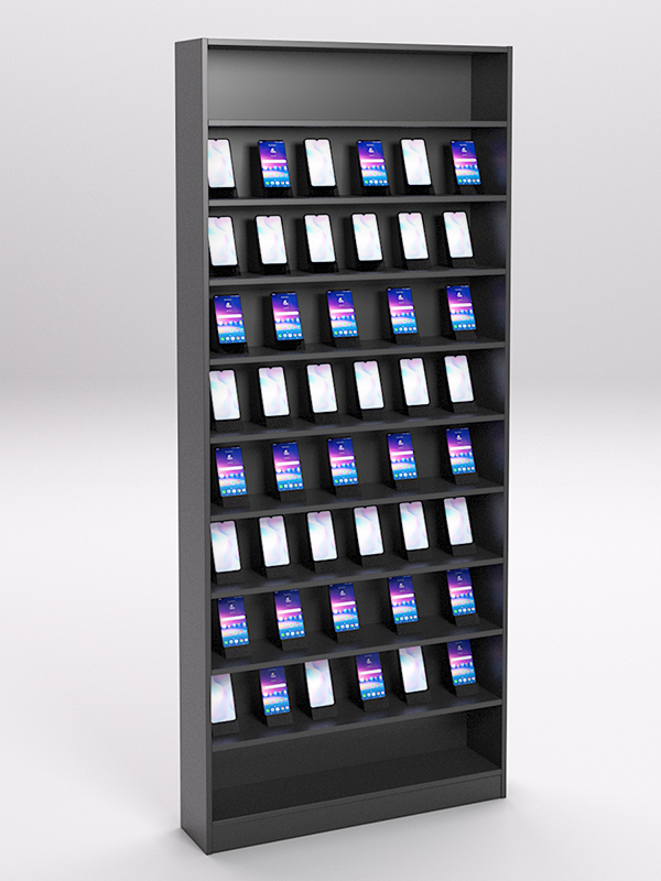 Стеллаж для экспозиции мобильных телефонов, смартфонов и других мелких устройств. Для размещения товаров имеется девять полок. Конструкция устанавливается вдоль стены и не занимает много места. Большое количество полок позволяет представить ассортимент в полном объеме.