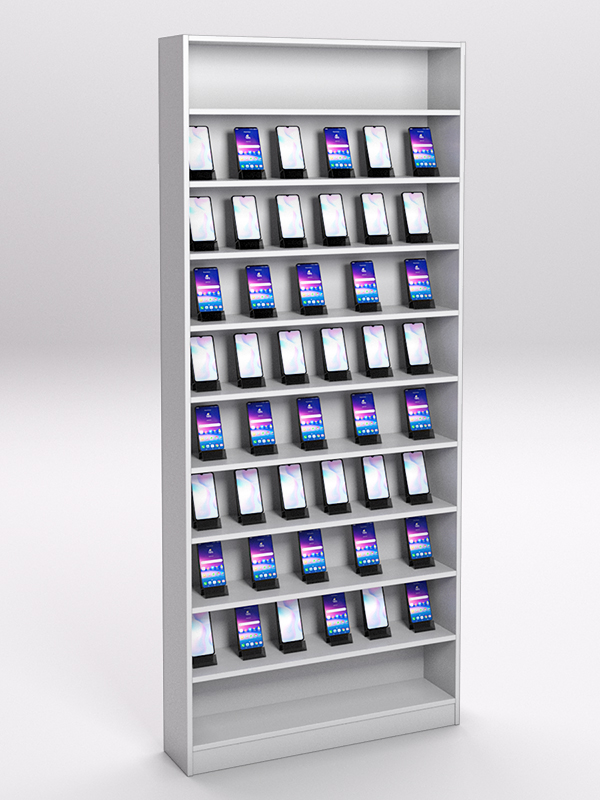 Стеллаж для экспозиции мобильных телефонов, смартфонов и других мелких устройств. Для размещения товаров имеется девять полок. Конструкция устанавливается вдоль стены и не занимает много места. Большое количество полок позволяет представить ассортимент в полном объеме.