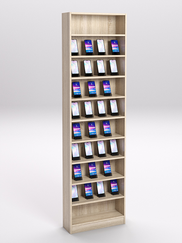 Стеллаж для экспозиции мобильных телефонов, смартфонов и других мелких устройств. Для размещения товаров имеется девять полок. Конструкция устанавливается вдоль стены и не занимает много места. Большое количество полок позволяет представить ассортимент в полном объеме.