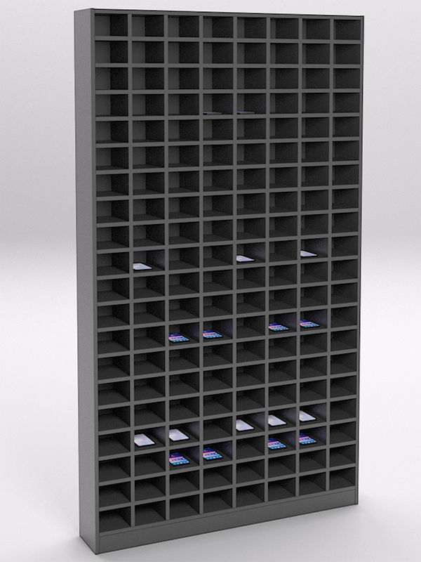 Стеллажи серии Сота представляют собой решетчатую конструкцию, в ячейках которой можно удобно разместить мобильные телефоны и гаджеты.