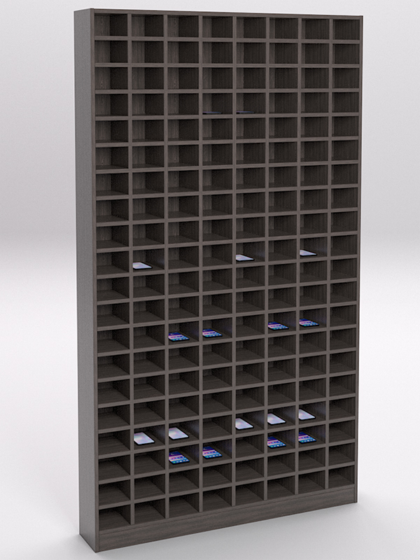 Стеллажи серии Сота представляют собой решетчатую конструкцию, в ячейках которой можно удобно разместить мобильные телефоны и гаджеты.