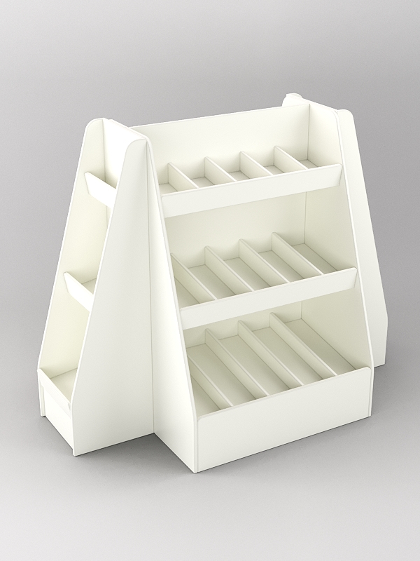 Стеллажи оборудованы наклонными полками, позволяющими легко брать товар, и ограничивающими бортиками, предотвращающими падение. Центральный стеллаж состоит из трех полок, каждая из которых разделена на четыре секции.